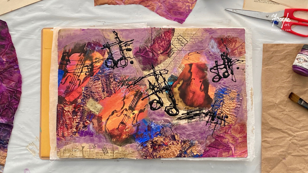 Step into my studio and allow me to lead you into the world of mixed media collage. Using an art journal, you will create a beautiful collage inspired by the musical score and splendour of this glorious cello design.