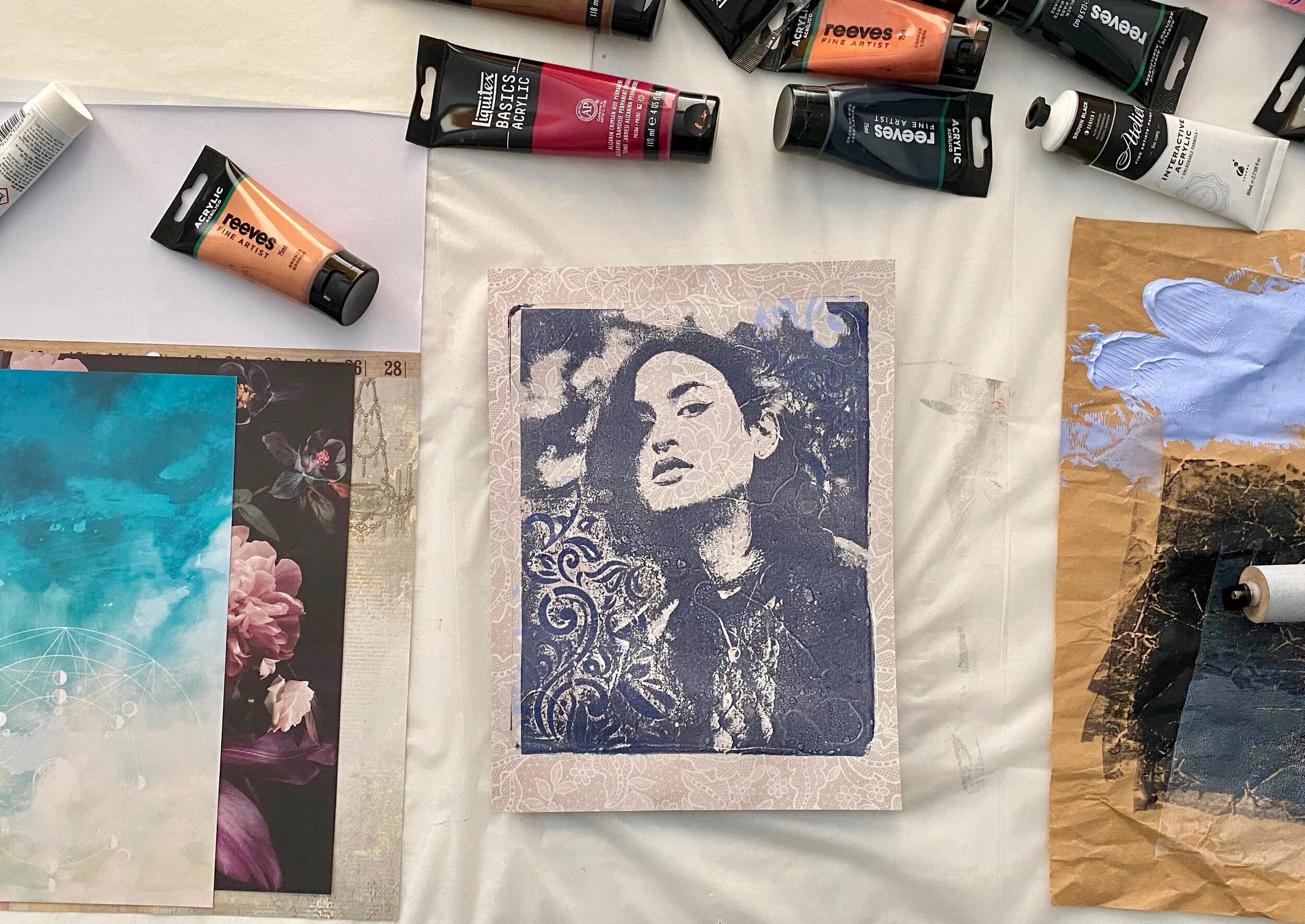 In this art class, I will teach you how to use your own photos to create successful image transfers with gelli printing.